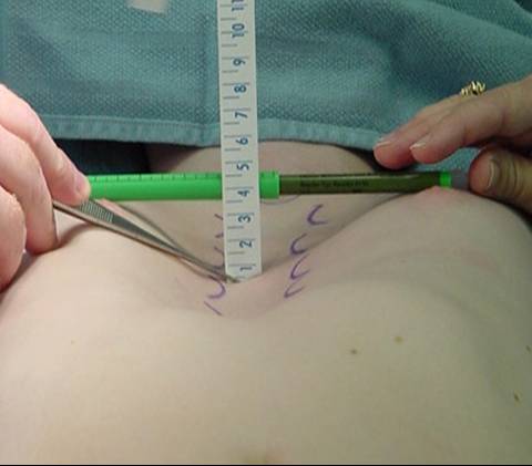 | Figure 2. A sterile marking pen marks the skin at the interspaces of maximal pectus depth on each side of the sternum. In this example, the pectus depth measures 4.5 cm. |
