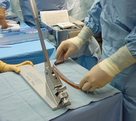 A malleable template of the previously measured length is selected (Figure 3) and molded to the ideal shape. The template is individually shaped for each patient to match the ideal chest wall shape by curving the template to match the curvature of the patient's chest. This shaping of the template includes very slight over-correction centrally. This template then is used to aid in shaping the stainless steel bar. The bar is bent and molded to match the template (Figure 4). Again, this shaping of the bar includes very slight central over-correction. Once shaped, the stainless steel bar is soaked in antibiotic irrigation until the patient is ready for retrosternal stainless steel bar insertion.