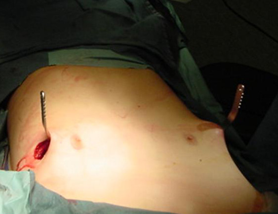 The preoperative anatomy is documented with photography in the AP plane (Figure 2) and lateral plane. Eventually, a retrosternal stainless steel bar will be placed from midaxillary line to midaxillary line at the level of maximal pectus depth. The length from midaxillary line to midaxillary line is measured in order to select the proper bar size.