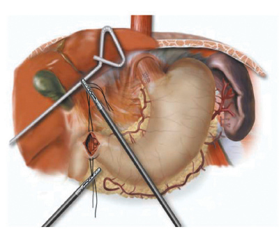 A laparoscopic jejunostomy tube is placed by creating an additional 10 mm port on the mid right abdominal wall for the endostitch device, then attaching a limb of jejunum approximately 20-25 cm distal to the ligament of Treitz to the anterior abdominal wall using a 2-0 endostitch. The large needle from the Compat kit is placed percutaneously into the peritoneal cavity under direct laparoscopic vision and directed into the loop of jejunum. The guide wire and catheter are threaded into the jejunum. The jejunum is tacked to the anterior abdominal wall with a total of three to four 2-0 endostitches followed by one stitch several centimeters distally from the feeding tube to prevent torsion of the jejunal limb. The feeding tube is secured on the skin with several 2-0 silk sutures.