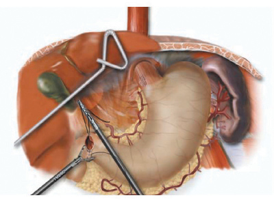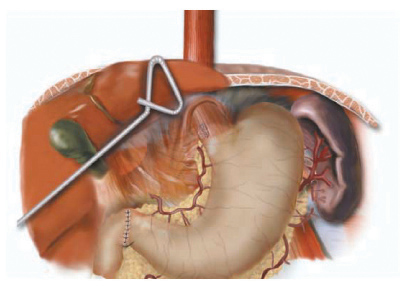 In the supine position, the double lumen ETT is exchanged to a single lumen tube, then 5 abdominal ports are placed on the anterior abdominal wall similar to the approach for a laparoscopic Nissen fundoplication: one cut-down 10 mm port in the right epigastrium and four 5 mm ports in the bilateral subcostal, left epigastrium and right flank locations (Figure 2). The left lobe of the liver is retracted upward to expose the esophageal hiatus using a Diamond- Flex retractor and held in place with a self-retaining system placed on left side of table. With the patient in maximal reverse Trendelenburg position, the dissection begins by dividing the gastrohepatic ligament and exposing the right crus of the diaphragm. The short gastric vessels are ligated using the ultrasonic shears and large endoclips. No clips are placed on the gastric side of the short gastric vessels to avoid potential displacement during the gastric pull-through. The dissection continues along the greater curvature of the stomach, preserving the right gastro-epiploic arcade. The stomach is retracted superiorly allowing lymph node dissection of the celiac and gastric vessels. Once the gastric artery and vein are exposed, they are divided using the EndoGIA II vascular stapler.