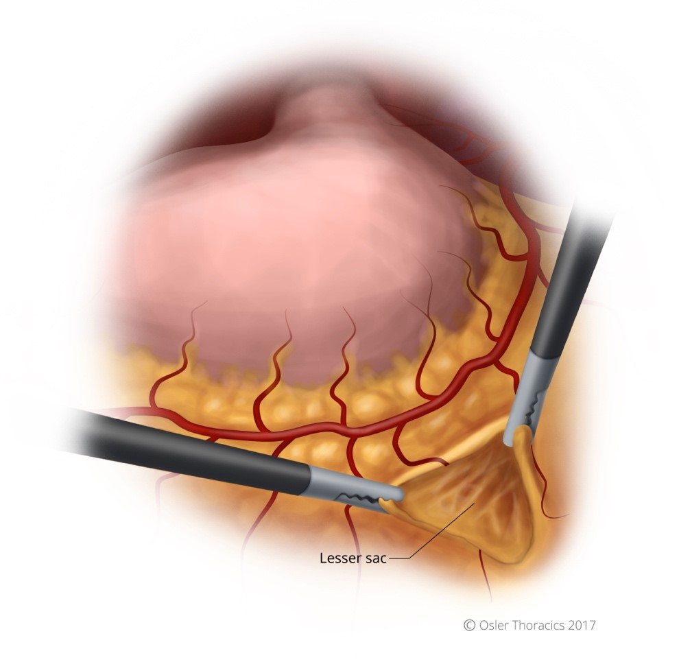 - Once this is done, use the left hand to lift the lesser curve of the stomach anteriorly, 2 - 3 cm distal to the gastroesophageal junction. This always demonstrates the contour of the LGA. The actual vessels may not be visible. However, the peritoneum, nodes, and fatty tissue around the artery will be appreciable.