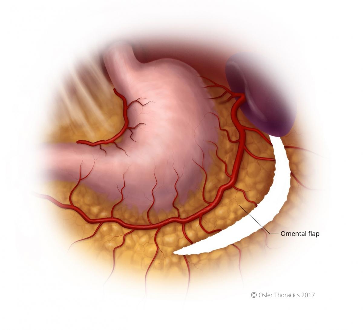 The omental flap extends from the halfway point of the gastrocolic omentum to the short gastrics. It allows the surgeon to cover the conduit staple line and the anastomosis. Obviously, it is critical to avoid the colon wall during this dissection.