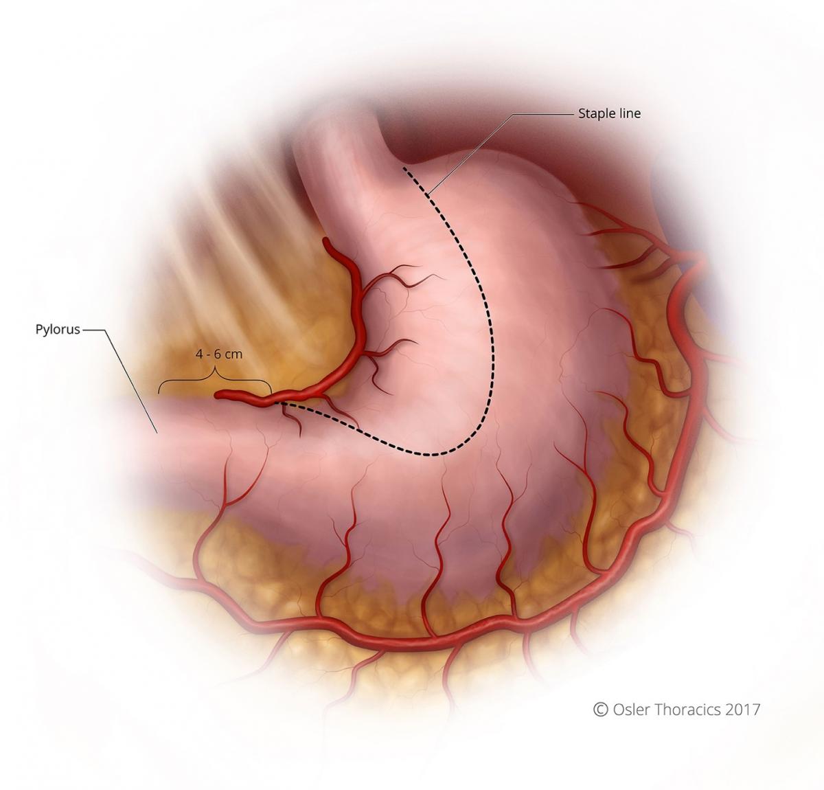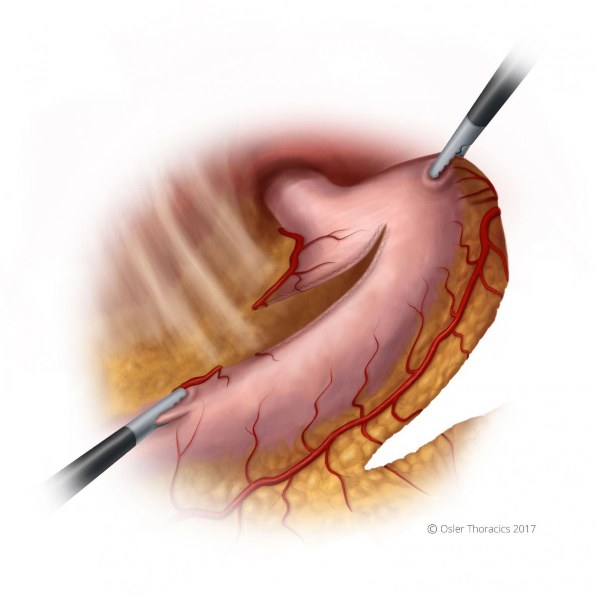 - Pearl: Consider using a green (Ethicon-Thick Tissue) staple load for the first staple firing along the lesser curve. This may prevent dehiscence in a typically thick area of the stomach.