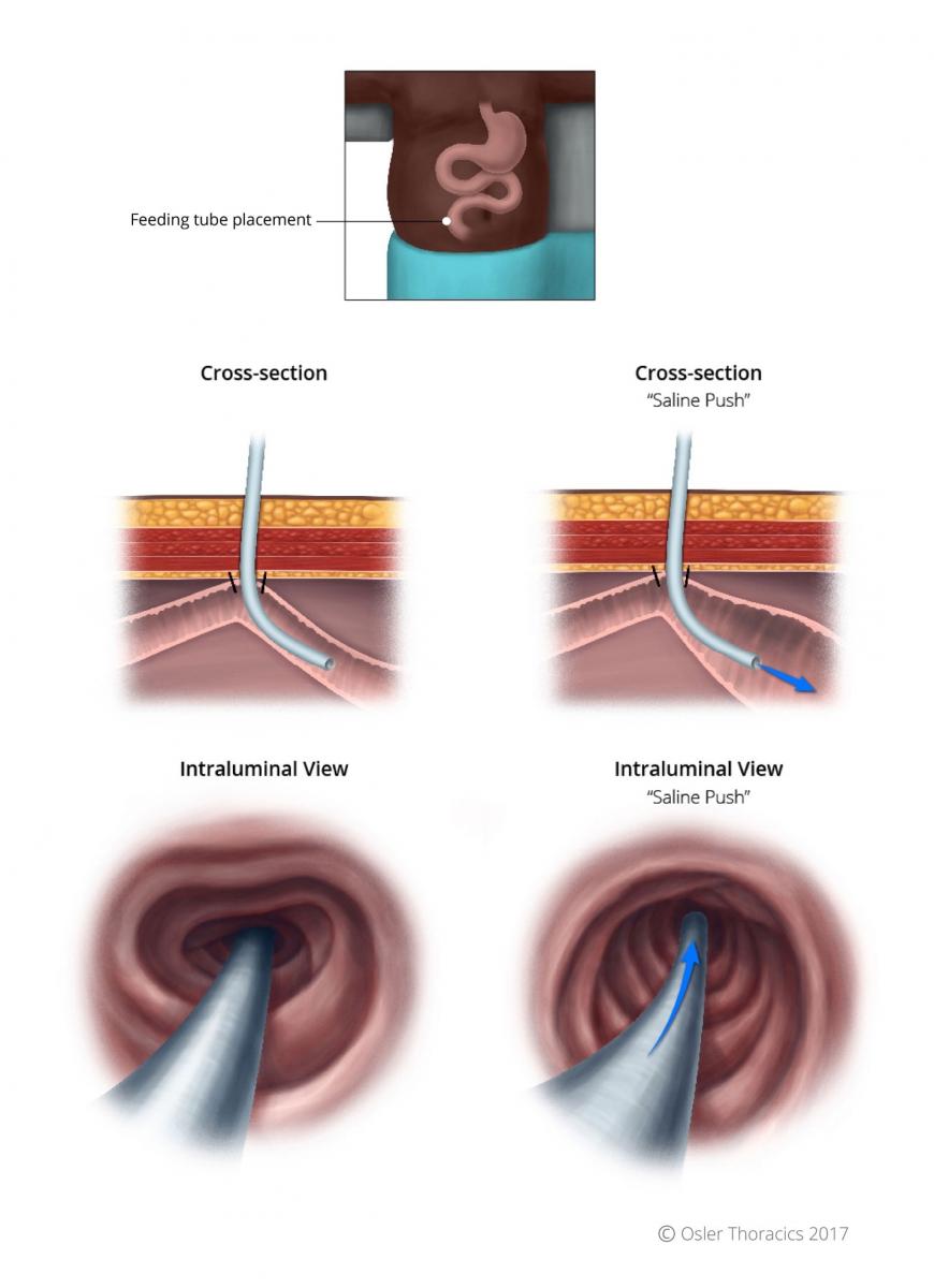 - Pearl: Feeding tube saline push. It can be occasionally challenging to thread the feeding tube distally. Once the feeding tube in inserted into the lumen, it is only advanced 4 - 5 cm. The guidewire and inner cannula are then removed. A 60 cc syringe filled with saline is attached to the feeding tube. The assistant pushes the saline through the feeding tube as they advance it. This creates a stream of saline that helps the tip of the feeding tube travel as distally as possible.