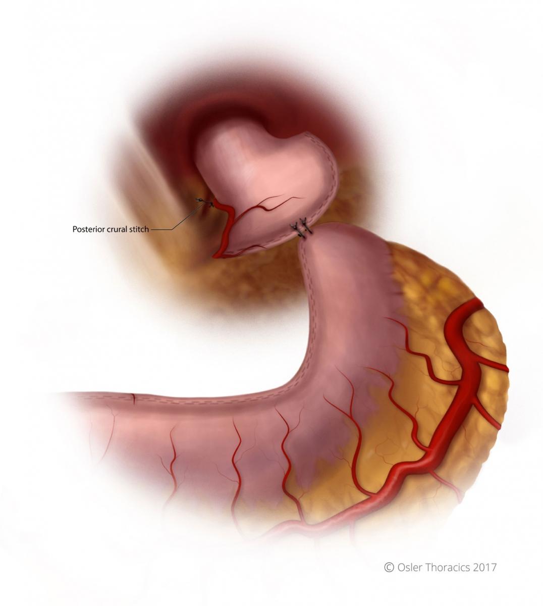 The authors have seen two of their long-term survivors return complaining of symptoms suggestive of conduit compression. Imaging revealed transverse colon herniation through a gaping hiatus. Although this is easy to fix laparoscopically, in patients with a large hiatus, the authors routinely place a posterior crural stitch. It should be snug enough to prevent herniation, but loose enough to allow for smooth delivery of the conduit into the chest. After the stich is complete, tuck the conduit into the mediastinum.