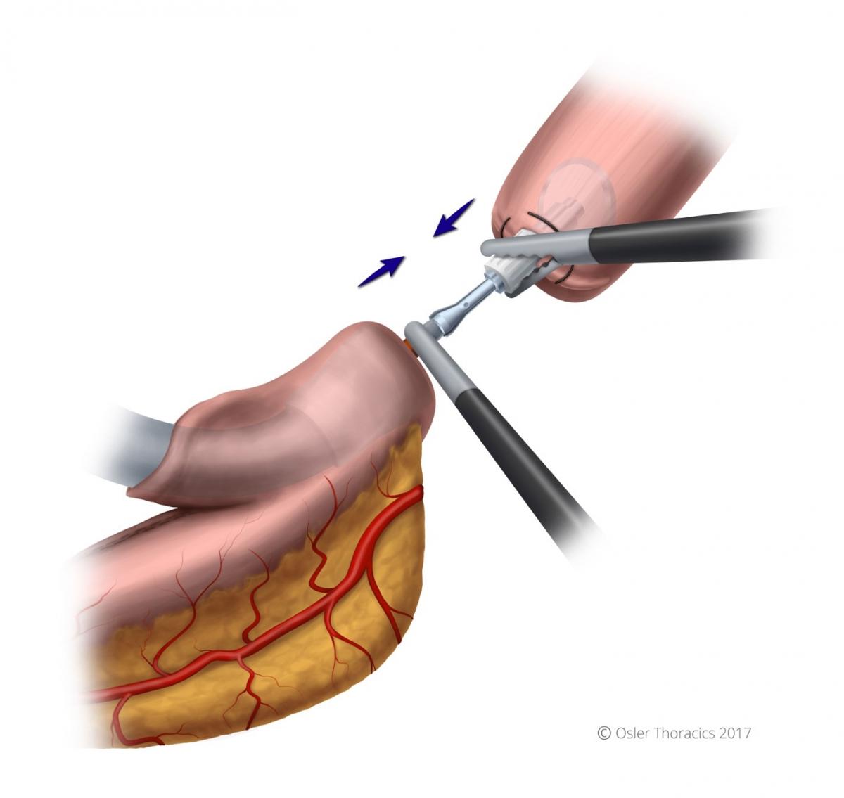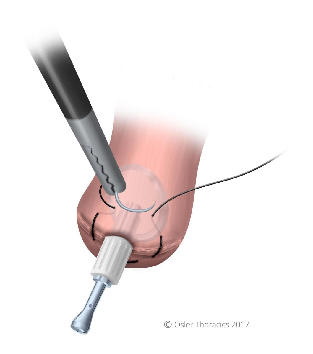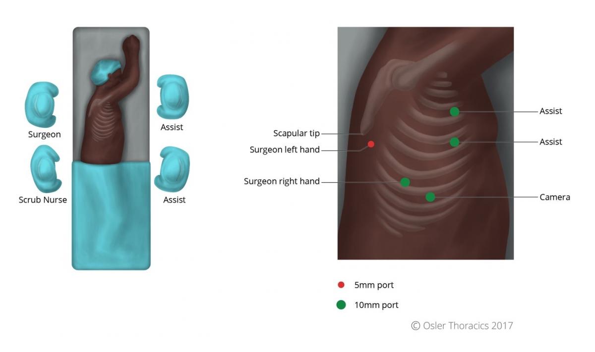 - The authors place two 10 mm assistant ports anteriorly in the fourth and sixth intercostal spaces, for a fan retractor and a suction device. As the initial dissection is in a closed system, a hand-controlled suction device is recommended to prevent negative pressure in the pleural space.