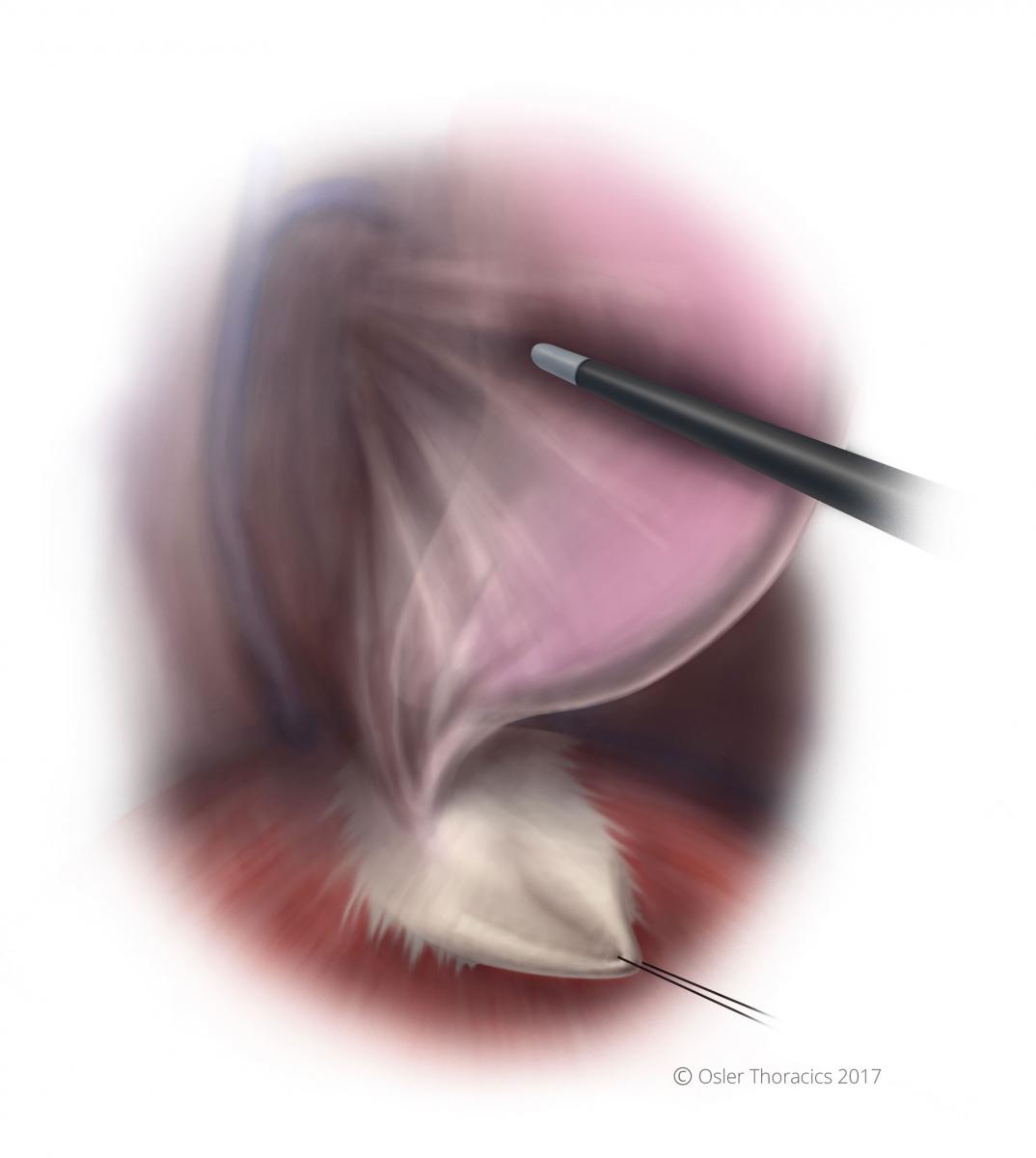 - Tip: The author performs minimal esophageal dissection at this time. As many patients have had radiation treatment, the dissection planes between the periesophageal tissue and the pleura are often obliterated. Inadvertent pleurotomies will result in a floppy diaphragm, which can be very bothersome for the rest of the procedure.