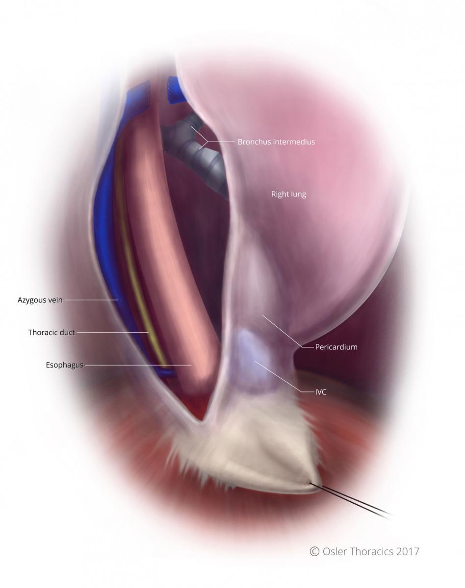 - The mediastinal pleura is divided along the hemiazygos vein. Once the azygos is reached, it is encircled and stapled. The esophagus is pulled laterally by the assistant’s right hand.