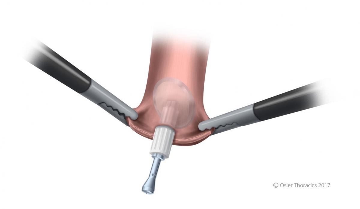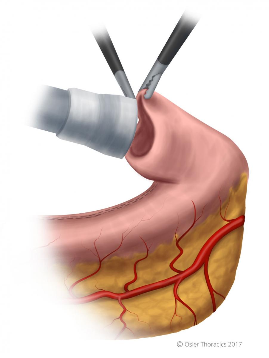- The harmonic scalpel is used to make a very small esophagotomy directly at the center of the staple line. Using gentle pressure, the assistant pushes the tube through the hole.
