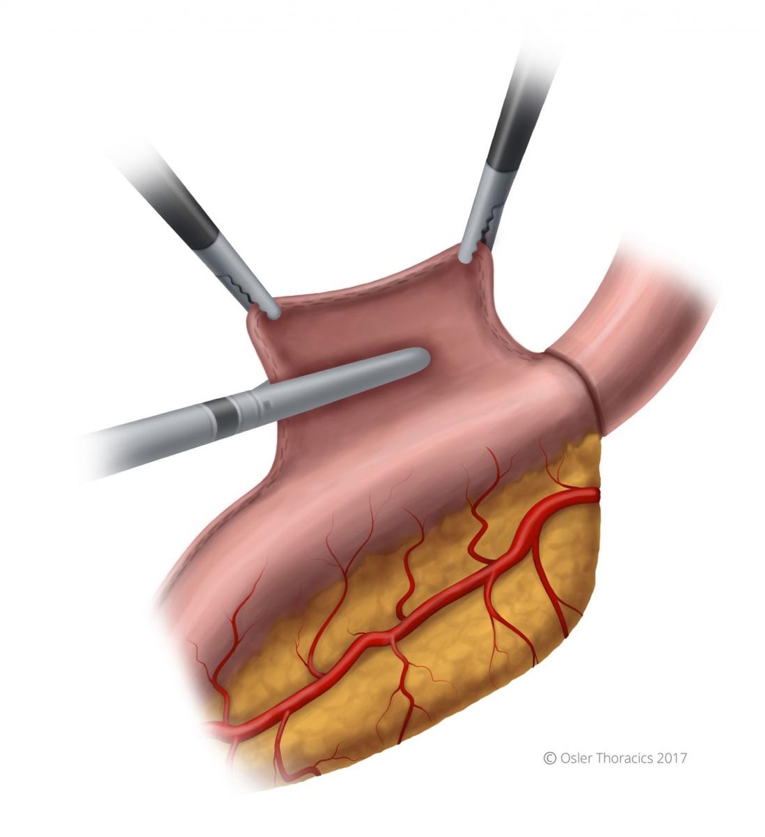 - Dissection is carried out along the pericardium, with the surgeon pulling the esophagus posteriorly.