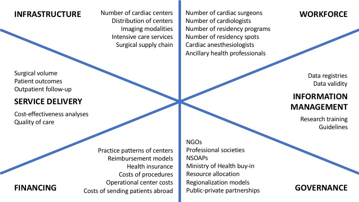 The reasons for the lack of access to cardiac surgical services are five-fold (Figure 1): geographical accessibility, material and human capacity, quality of care delivery, episodic affordability, and, importantly, social favorability. Around the world, countries have started developing health systems-based approaches to strengthen the surgical ecosystem within a country to facilitate the delivery of increasingly complex procedures at increasing volumes, under the umbrella of National Surgical, Obstetric, and Anesthesia Plans (6). Unfortunately, cardiac care has largely been neglected within this movement. Nevertheless, an adaptation of the framework allows for a dissection of the problem areas for the provision of high-quality, high-volume cardiac surgical services in low- and middle-income countries (LMICs), as summarized in Figure 2. Importantly, better understanding gaps in the workforce (including sex-based disparities within entire cardiac teams), cardiac centers, surgical volume, and operational cost and cost-effectiveness data will be instrumental to systemically change the paradigm.