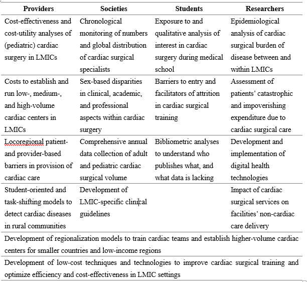Table 1. Global cardiac surgery research action items for health care professionals, professional societies, medical and public health students, researchers, and other stakeholders. Note: this list is non-exhaustive. LMICs = low- and middle-income countries.