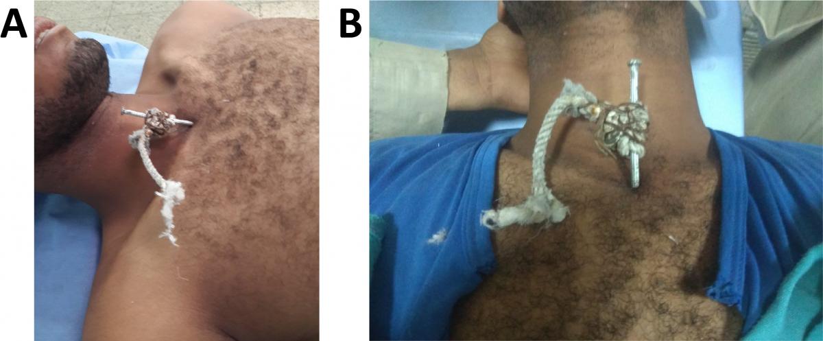 In the authors’ opinion, the variability of the effect of the injury is related to many factors: the length and thickness of the nail, the direction of penetration, the power of the firing gun and its distance from the victim, time lag from the accident to hospital presentation, hospital facilities, and the wise management of the patient from the time of accident until hospital arrival. In this situation (Figure 1), we noticed a rope fixed around the nail that was related to a failed attempt by the patient’s relatives to extract the nail by pulling on the rope at the scene of the accident. In fact, the relative’s trial is very risky and should not be done.