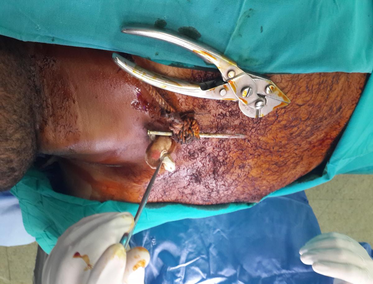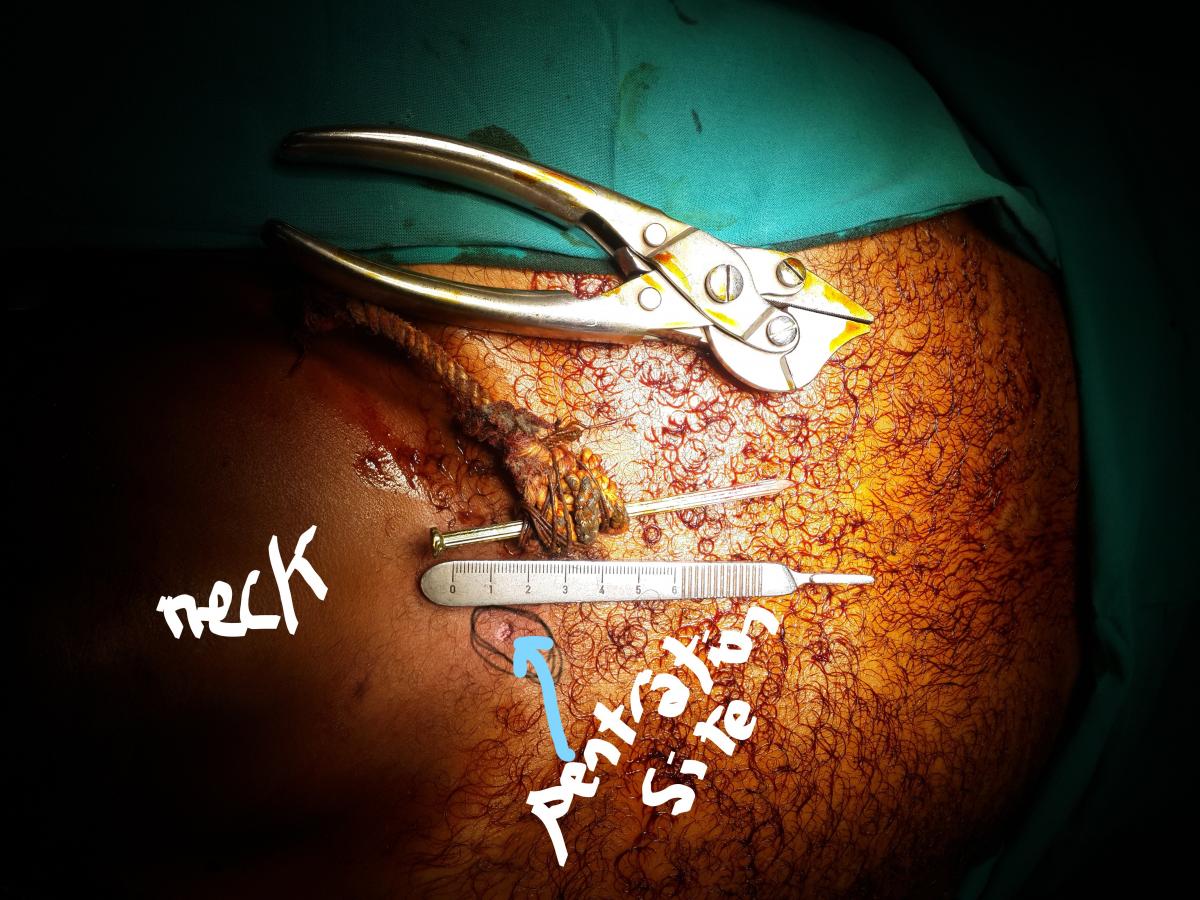 Figure 4. Illustration of the penetration site. The size of the nail is 10 cm. No bleeding from the penetration site.