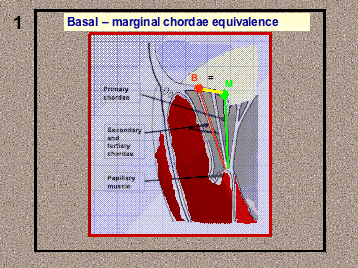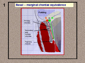 - Basal-marginal chordae equivalence (Figure 1). The height of a marginal (or primary) chordae is equal to that of the corresponding basal (or tertiary) chordae. This is anatomically true in the posterior leaflet, but we can also apply this principle to the anterior leaflet. We can verify this height equivalence by folding the leaflet and moving the marginal chordae to the position of the corresponding basal chordae (Figure 2).