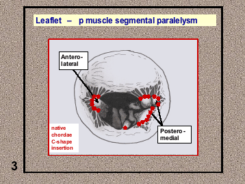 - Leaflet - papillary muscle segmental correspondence. The insertion of all the native chordae at both papillary muscle groups depicts a C-shaped line and these chordae spread in a fan-like disposition towards both leaflets without crossing the midline (Figure 5). A segmental correspondence exists between the site of native chordal insertion at the level of both papillary muscles and leaflets (Figure 6). Ideally, neochordal repair should reproduce this native anatomical arrangement.