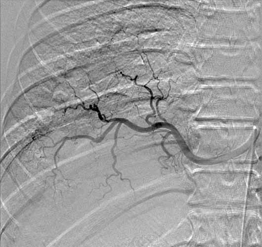 A previously healthy 43-year-old male presented with cough, fevers, and leukocytosis. A chest radiograph (Figure 1) revealed extensive consolidation in the right lower lung containing multiple cavities with air-fluid levels consistent with a necrotizing infection. A chest computed tomogram (Figure 2) showed an abscess cavity and consolidation in the right lower lobe with an aberrant blood supply from the descending aorta. This systemic blood supply was confirmed by subsequent 3D reconstruction (Figure 3). He was initially treated with IV antibiotics, resulting in normalization of his temperature and white blood cell count. He was then discharged home on a 3-week course of oral antibiotics. Three days prior to a planned surgical resection, he underwent angiographic localization of the feeding artery (Figure 4) and coil embolization (Figure 5).
