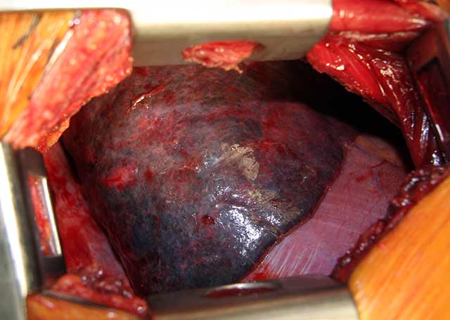 Flexible bronchoscopy revealed normal bronchial anatomy (Video 1). There was no evidence of stricture. All segmental airways were present. A right thoracotomy was performed. The sequestration appeared as a bluish mass incorporated in the substance of the right lower lobe (Figure 6). The artery supplying the sequestration was visualized coursing through the inferior pulmonary ligament and divided (Figures 7, 8; Video 2). Alternating single and double lung ventilation, the sequestration was identified along the basolateral margin of the right lung (Video 3) with a clear line of demarcation. A combination of electrocautery and 4.8mm endoscopic staplers (Video 4) was used to separate normal lung from the sequestration (Video 5). Fibrin glue was applied to all staple lines. Normal bronchial airways were not divided and the remaining lower lobe inflated normally (Video 6). The post-surgical course was uncomplicated and the patient was discharged on post-operative day four. Pathology revealed parenchymal cyst formation with chronic inflammation and organizing pneumonia.