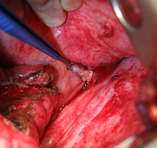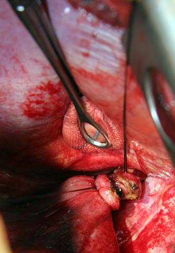 | Figure 6: Intraoperative image of bluish-hued sequestration | Figure 7: Feeding artery ligated and partially divided | Figure 8: Cut end of feeder artery off aorta |