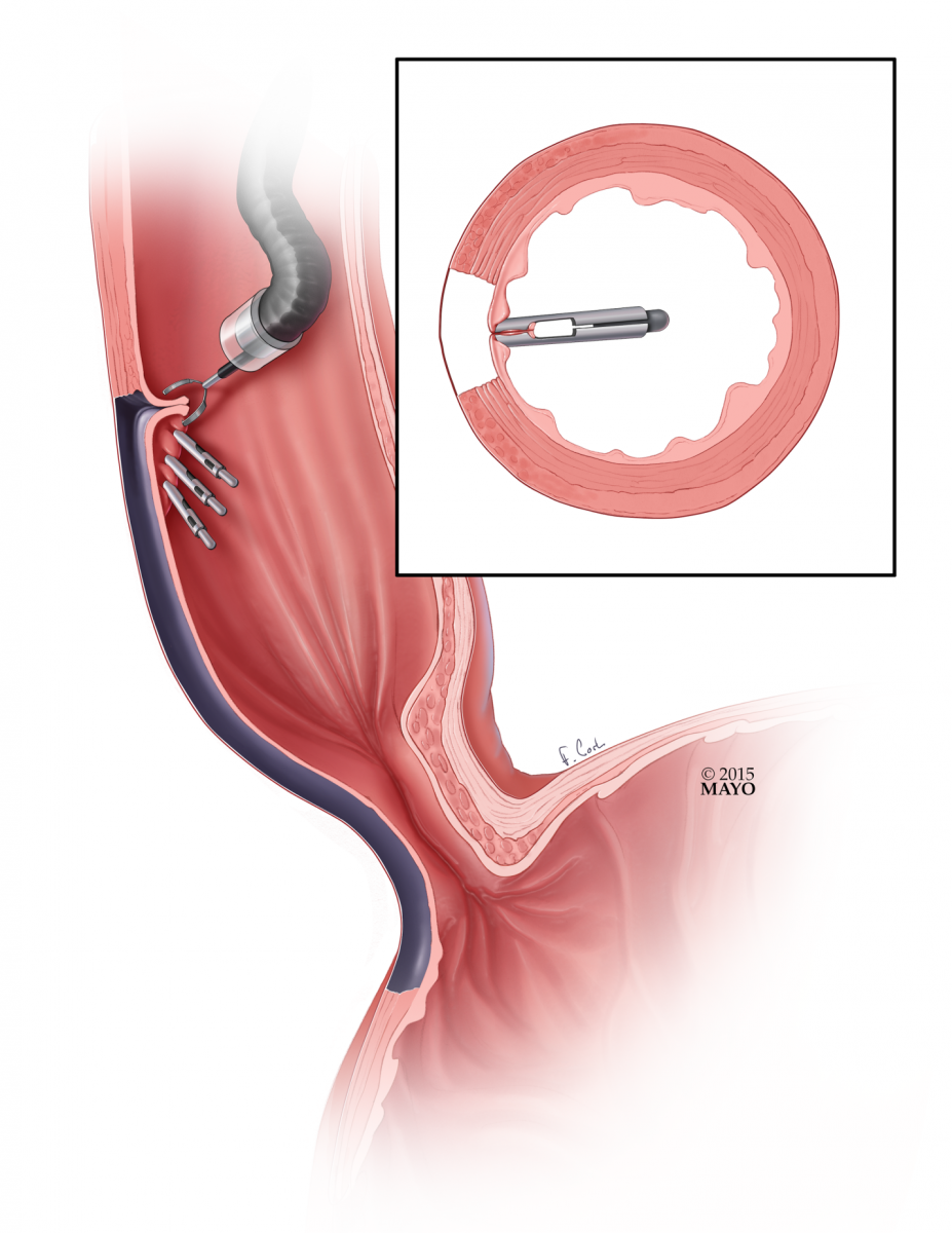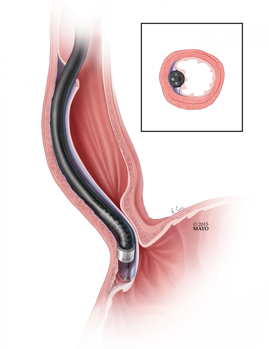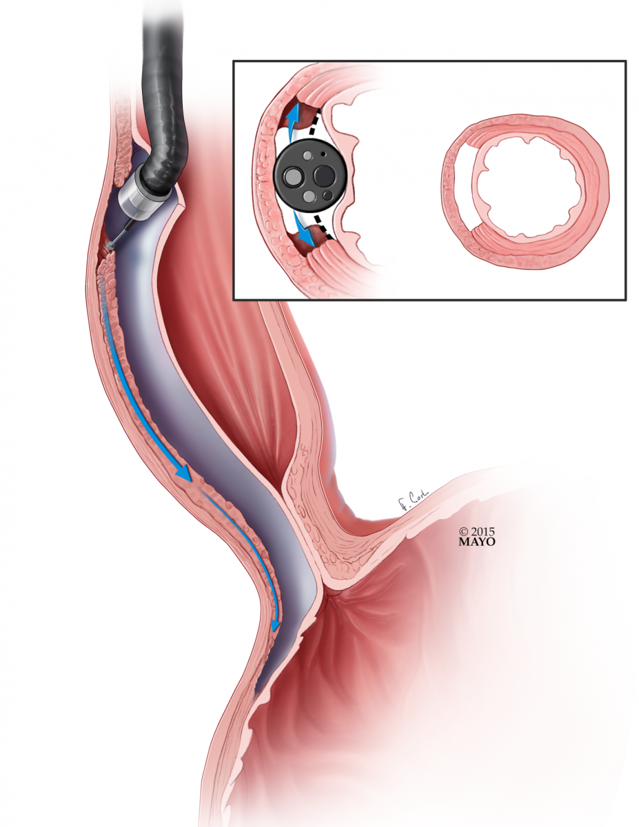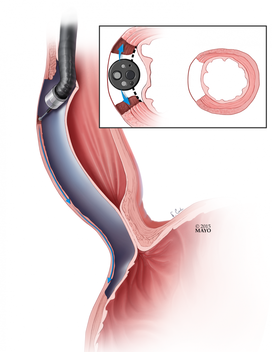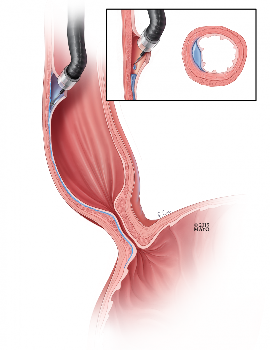 A newer option, available in specialized centers, is peroral endoscopic myotomy (POEM). POEM is a totally endoscopic procedure, utilizing the advanced endoscopic technique of submucosal tunneling. Once positioned well above the UES (upper esophageal sphincter), a submucosal fluid cushion is created and an incision is made with an endoscopic knife (Figure 1). The scope is advanced into the submucosal layer of the esophagus (Figure 2). Using water jet injection, suction, low-dose energy ablation, and blunt dissection, the scope is advanced past the esophago-gastric junction in the submucosal plane (Figure 3). Either a myotomy limited to the circular muscle (Figure 4) or a full thickness myotomy (Figure 5) is then performed. The mucosal incision is then closed with hemostatic clips (Figure 6).