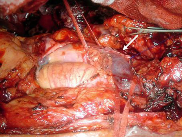 | Figure 10. Chest CT-scan shows the invasion of the subclavian artery by Pancoast tumor. | Figure 11. The invaded artery was resected and replaced by a PTFE graft through a posterior approach. |
