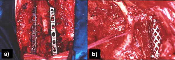 The classic posterior approach can be used to perform a total or partial vertebrectomy and neural foramina or transverse process resection [14, 19]. In patients with neural foramina or transverse process invasion only, the transverse process is drilled out with a high-speed diamond burr power drill, and the nerve roots are ligated and divided. If there is significant involvement of the surrounding osseous structures, a multilevel laminectomy and total or partial vertebrectomy are carried out through a posterior midline extension of the thoracotomy. The vertebrectomy defect may be reconstructed with autologous bone or a prosthesis. Anterior fixation is obtained with placement of an anterior locking plate and screw construct, and posterior fixation using rods fixed with screws and hooks is done with extensive resections and multilevel laminectomies (Figures 18-19). With a radical resection in the case of vertebral involvement, the transverse process and vertebral body must be resected first, before continuing the operation.