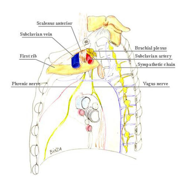 Several surgical approaches have been described for Pancoast tumor, ranging from posterior access [11] to anterior accesses [15-17], alone or in combination. The classic posterior approach popularized by Paulson and Shaw [11] gives excellent exposure of the posterior chest wall but does not allow safe, direct visualization and manipulation of more anterior anatomical structures forming the thoracic inlet. In particular, the management of invaded subclavian vessels (particularly the subclavian vein) is difficult and dangerous, often requiring an anterior approach. Therefore, a detailed knowledge of the anatomy of the apex of the chest and lower neck (Figure 3) and the availability of alternative approaches in their armamentarium are essential for surgeons managing these tumors.