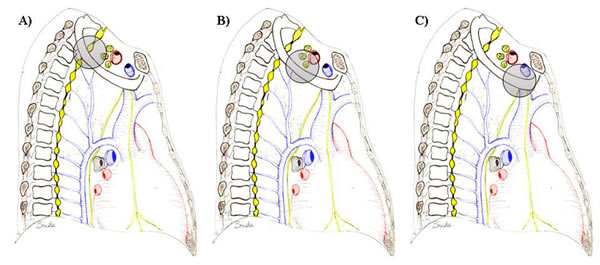 | Figure 3: Diagram of the thoracic inlet from a left lateral view. | Figure 4: The Pancoast tumor can invade the thoracic inlet in a posterior (A), middle (B) or anterior (C) site. |