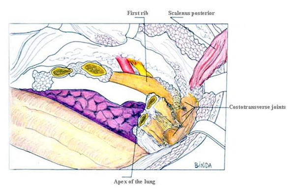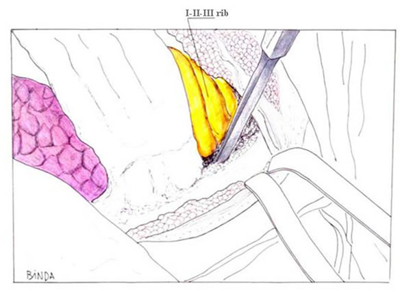 | Figure 7: Anterior resection of the 2nd and 3rd ribs. | Figure 8: Anterior resection of the 1st rib. | Figure 9: Diagram showing the disarticulation of the rib from the transverse process. |