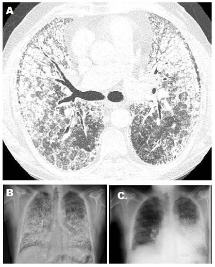 Figure 1. A) CT scan shows PAM findings. B) Chest X-rays previous to SLT. C) Chest X-rays 6° month follow-up right SLT.