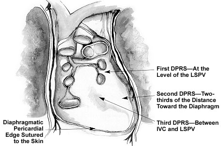 For Anterior LV wall (Figure 1) presentation (Anterior Descending, Diagonal, Ramus), a deep pericardial retraction suture, (DPRS, #1 Silk or Ethibond) is placed 1-2 centimeters above the left superior pulmonary vein ( Figure 2), pulled taut and secured to the drape on the left side of the patient. If necessary, especially for the Ramus, an additional deep pericardial retraction suture (second in Figure 2) is placed anterior to the phrenic nerve and caudal to the first deep pericardial retraction suture. Additional deep pericardial retraction sutures are positioned until the target vessel is midline in the sternal incision. Placement of these deep pericardial retraction sutures must be done deliberately and quickly. The retraction required to expose the posterior pericardium causes severe hemodynamic compromise. The blood pressure will recover faster if the patient is head down with preparatory volume loading.