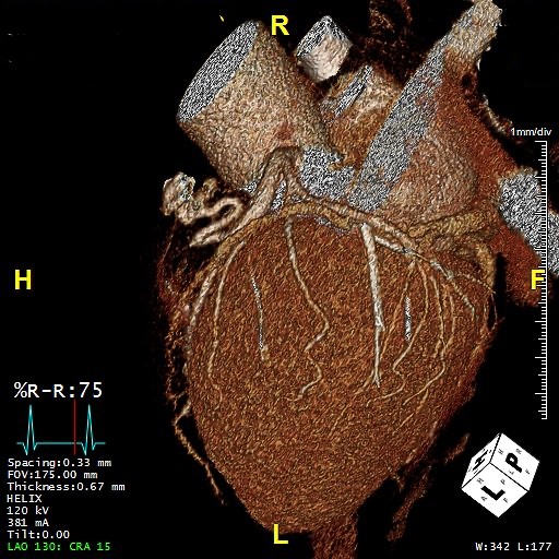 3D computed tomography imaging reconstruction of the LAD and PA and their insertion point to the PA are depicted.