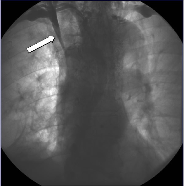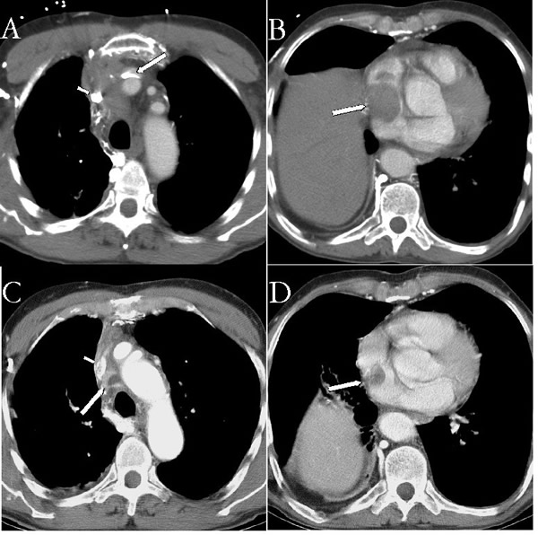 | Figure 1A Pre chemotherapy CT showing tumor at the confluence of the innominate veins (see arrows). | Figure 1B Pre chemotherapy CT showing tumor extending down into the right atrium (arrow). |