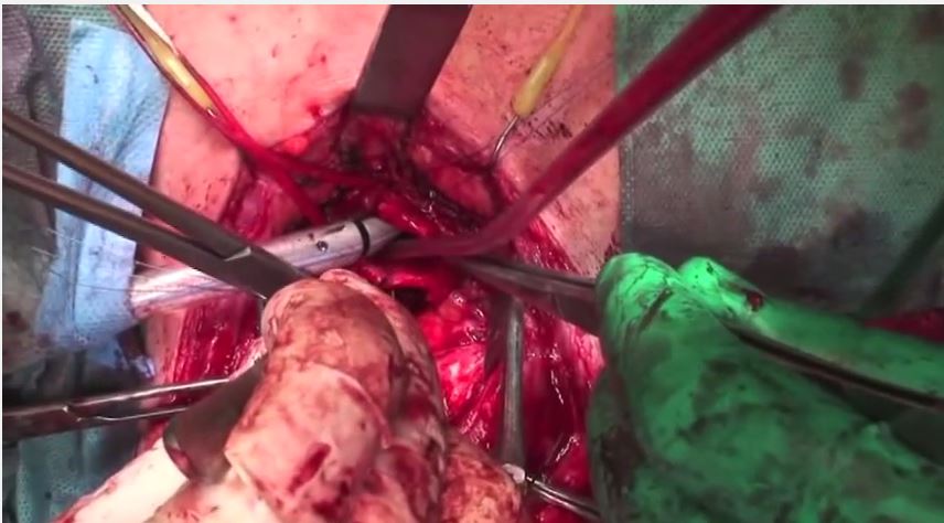 Once the tracheal stenosis was completely isolated, the anesthetist was asked to deflate the cuff on the endotracheal tube. A flexible endotracheal tube with its connectors and sterile anesthesia tubing were clipped into place at the level of the incision, and the proximal anesthesia tubes were passed through the drapes to the anesthetist. The trachea was then divided transversely. The distal trachea was intubated across the operative field, inflating the cuff just enough to obtain a seal. Dissection was completed in areas of difficult scarring until the proximal end of the area of stenosis was reached. Great care was taken proximally when approaching the cricoid cartilage with its severe inflammatory reaction.
