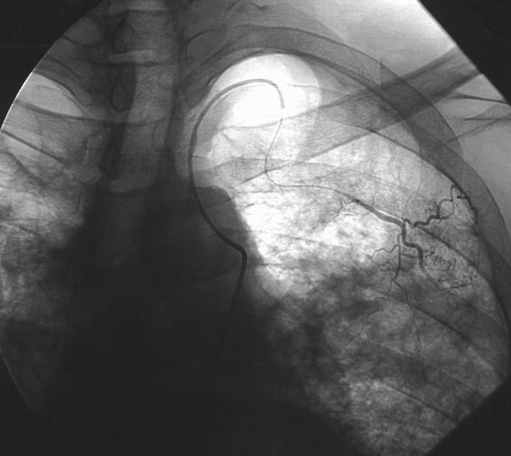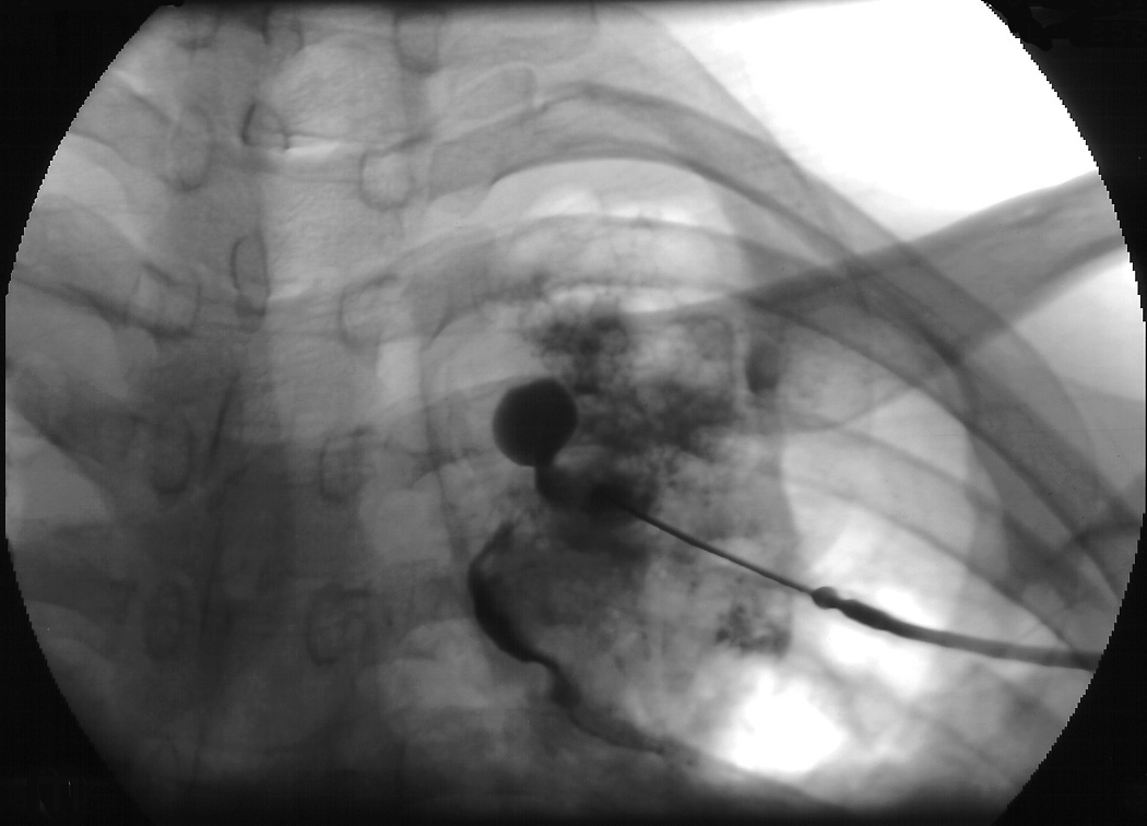 The definitive treatment of symptomatic aspergilloma is surgical resection. Patients with aspergilloma who present with hemoptysis are at risk of death due to massive hemoptysis and/or respiratory insufficiency caused by aspirated blood. Catheter embolization of bronchial arteries can be used to control acute bleeding (Figure 1), but is not durable. Likewise, intracavitary instillation of antifungal agents has mixed outcomes and seldom results in complete resolution of the cavity (Figure 2 ) 1. Systemic antifungal agents play little role as primary treatment because they do not penetrate the aspergilloma cavity 2. Resection in appropriate patients provides a definitive diagnosis and a durable treatment response.
