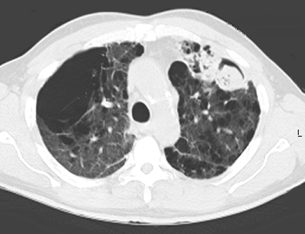 Unfortunately, most patients with aspergilloma have significant underlying pulmonary disease and are at increased risk for resection. An aspergilloma in the setting of underlying pulmonary disease is referred to as a complex aspergilloma (Figure 3). Associated pulmonary diseases in our practice have included bronchiectasis, sarcoidosis, COPD, lung abscess, rheumatoid lung disease, tuberculosis, and complications of systemic immunosuppression.
