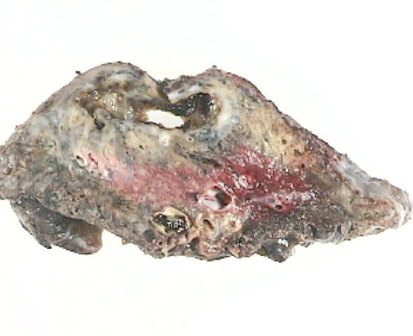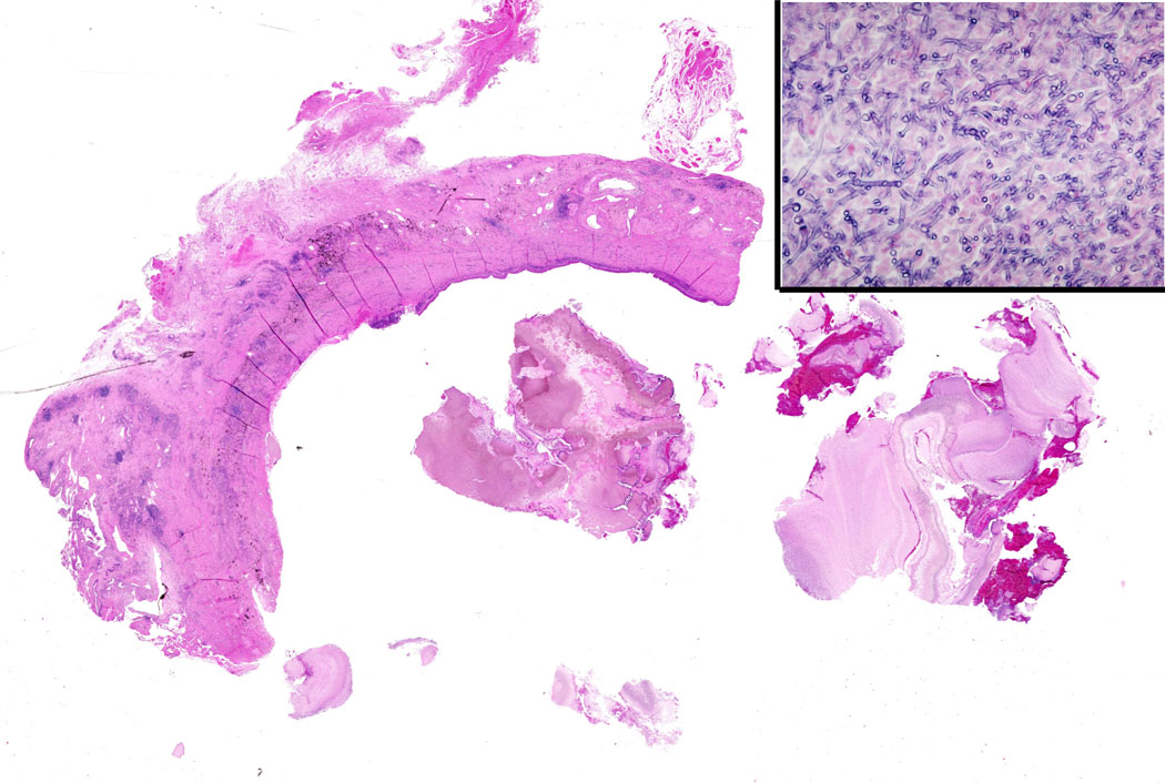 A standard lobectomy is performed. Dissection in the fissure is avoided as this will only lead to prolonged postoperative air leak. Instead, once the arterial anatomy has been defined, the fissures are completed with a stapling device. In rare instances the pulmonary parenchymal tissue is too thick to staple; in those cases, it must be taken with a clamp, cut, and then over sewn with chromic suture. A resected specimen is shown in Figure 5 along with the micrograph showing the typical appearance of recovered fungal elements (Figure 6).