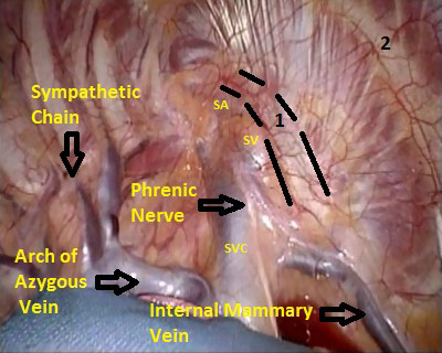 The operation is performed on a video-assisted thoracoscopic surgery (VATS) platform. The robot is used to dissect the first rib and divide the scalene muscles. The procedure is performed in four phases. The patient is placed in the lateral decubitus position with the affected side up and hips slightly flexed with minimal reverse Trendelenberg. An anesthesiologist with experience should be managing the airway because of limited control during the robotic part of the operation. Single-lung ventilation is used to facilitate exposure and dissection. Three 2cm incisions are made for camera and working ports. Incision #1 is made in 5th intercostal (IC) space at midaxillary line; this incision will be used for camera placement. Incision #2 is made in 4th IC space at the anterior axillary line. Incision #3 is made in the 4th IC space at the posterior axillary line. One 1cm incision is made both for retractor (Endopaddle Retract; Auto Suture, Covidien, Mansfield, Ma) placement and postoperative chest tube placement. This incision is made in the 6th IC space at the anterior axillary line (Figure 1). The robot (da Vinci, Intuitive Surgical, Sunnyvale, CA) is brought in from the head of the bed. The camera robotic arm is placed in incision #1. The right robotic arm with hook cautery is placed in incision #2. The left robotic arm with an endograsper is placed in incision #3. It is crucial to identify the following structures: subclavian vein, subclavian artery, first rib, second rib, sympathetic chain, phrenic nerve, and the superior vena cava (Figure 2). Hook cautery is used to dissect the parietal pleura and periostium off the rib, outlining the first rib. The dissection is carried medially to the costosternal junction, laterally to the vertebral body, anteriorly to the border of the rib, posteriorly to the border of the rib, and superiorly 3mm onto the upper surface of the rib in a cephalad extrathoracic direction (Figure 3). Dissect the borders of rib enough so that the borders of the subclavian artery, vein, and rib can clearly be distinguished. The thickness of the rib is assessed and the area between the subclavian vein and artery is isolated. This area represents the thinnest portion of the first rib and is most suitable for an osteotomy. In this phase, the robotic arms are withdrawn and the rib is cut between the subclavian vein and artery using a 6mm thoracoscopic Kerrison bone cutter (Depuy, Raynham, Ma). This area represents the thinnest portion of the first rib. Division of the rib at its midpoint allows for the rib to be pivoted on the sternocostal joint in a trap door configuration (Figure 4). Figure 2. Intraoperative photograph showing the location of the important anatomical structures. 1- first rib, 2- second rib, SA- subclavian artery, SV- subclavian vein, SVC- superior vena cava. Figure 3. Intraoperative photograph demonstrating the extent of dissection outlining the first rib. L-lateral, M-medial, A-anterior, P-posterior. Figure 4. The divided first rib. The rib is made into a trap door configuration pivoting at the sternocostal joint. L-lateral, M-medial, A-anterior, P-posterior. Figure 5. Posterior dissection of the first rib. One hook cautery is used for dissection while the other hook cautery is used for retraction. P-posterior. A hook cautery is placed in both robotic arms. The arms are replaced in their original positions. In an alternating fashion, depending on the anatomy, the hook is used for retraction as well as cautery dissection of the first rib (Figure 5). Dissection is continued with the hook cautery, staying intimate with the first rib to avoid injury of nearby neurovascular structures. Scalenus anticus and medius are subsequently divided from the first rib. As the first rib is freed from its surrounding tissues, the first rib is retracted in a trap door configuration to aid in dissection at the costosternal joint. Once adequate dissection has occurred, the rib is disarticulated from its respective joint. The robot is removed and the rib is placed in a large endobag (Endopouch specimen retrieval bag (10mm diameter), Ethicon) and extracted from the thoracic cavity through a 2cm port. The retractor is removed from incision #4 and a 24Fr chest tube is placed through this incision. The lung is reinflated and the incisions are closed. There were 13 first rib resections in 9 patients. 4 patients underwent staged bilateral first rib resection. There were 6 men and 3 women. Mean age was 34 +/- 8.5 years. At the time of initial presentation, on ultrasonography the subclavian vein was thrombosed on the right side in 7 patients and left side in 2 patients. In 4 patients who underwent staged bilateral first rib resection, surgery was performed prior to subclavian vein thrombosis. In 8/9 (89%) patients, subclavian vein thrombosis occurred with activity involving the upper extremity. In 1/9 (11%) patients, subclavian vein thrombosis was associated with an indwelling catheter. Prior to referral for surgery, all patients were anticoagulated. On physical exam, all patients had swelling of the affected arm. All operated extremities demonstrated positive Adson and Wright signs. All patients were evaluated for underlying coagulation disorders. Coagulation studies were negative in 5/9 patients (56%). Factor V Leiden deficiency was seen in 1/9 patients (11%). Mutation in the MTHFR gene was diagnosed in 3/9 patients (33%). Prior to surgical intervention, static upper extremity venography showed an open subclavian vein in 7/9 (78%) patients and an occluded subclavian vein in 2/9 (22%) patients. On hyperabduction of the affected extremity, there was occlusion of the vein at the sternocostal junction in 7/9 (78%) patients. In the 2 patients with an occluded subclavian vein, there was engorgement of the collateral vessels with hyperabduction of the affected extremity. Upper extremity venography of the unaffected side showed a patent subclavian vein in 9/9 (100%) patients. However, hyperabd