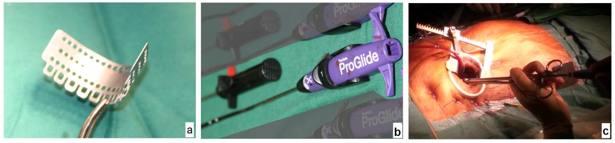 Some instruments used for single incision minimally invasive cardiac surgery include a) an atrial retractor, b) Perclose ProGlide device, and c) the Glauber clamp.
