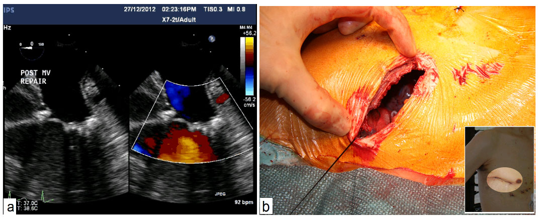 Postoperative echocardiography shows good repair results (a) and a single small chest scar after surgery (b)