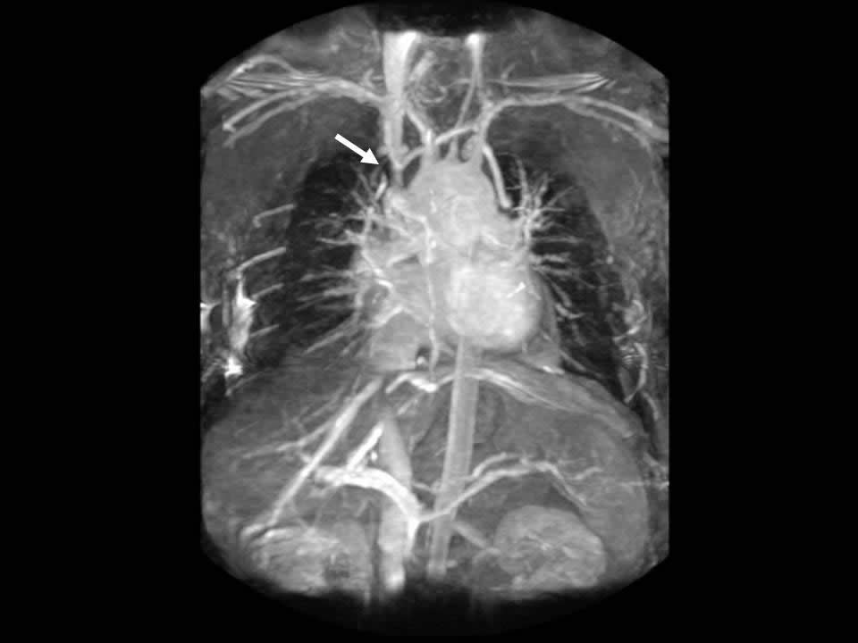 On physical exam the patient had an obviously swollen head without cyanosis, but with multiple collaterals over her chest and upper neck. An MRA was obtained which demonstrated complete obstruction of the superior vena cava below the brachiocephalic junction (Figure 1). There were also significant collaterals through the intercostals and internal mammary veins, but no evidence of intrathoracic mass, adenopathy, or evidence of vein thrombosis.