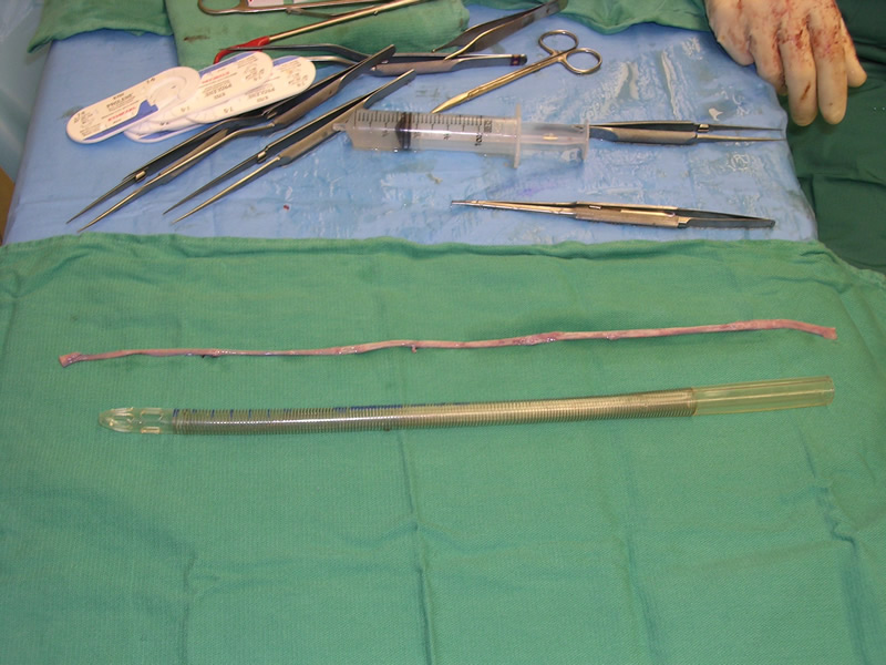 The patient was taken to the operating room where a standard median sternotomy was performed. Inspection revealed a left brachiocephalic vein that was completely obliterated and non-functioning. The SVC was normal at its junction with the right atrium, but at approximately mid level it was noted to be scarred and atretic to the level of the right internal jugular and right subclavian veins (Figures 2 and 3). Simultaneously the left saphenous vein, from inguinal canal to the ankle, was harvested endoscopically (Figure 4). Once harvested the vein was incised and opened longitudinally along its entire length. Using a standard 2-stage venous cannulae, a spiral vein graft was constructed using running 7-0 prolene suture, exchanging suture with each completed turn (Figures 5 and 6). The vein graft was left on the end of the cannulae and using a parachute technique an end-to-end anastomosis was first created in the distal SVC at the confluence of the right internal jugular and subclavian veins. The proximal anastomosis was constructed below the level of the obstruction at the entry area of the azygous vein. Following de-airing, inspection revealed the vein graft to be widely patent with no thrill or kinking (Figure 7). The patient was discharged home with coumadin with goal INR of 2.0 for 6 months. At six month follow-up, the patient reports significant improvement in her symptoms.