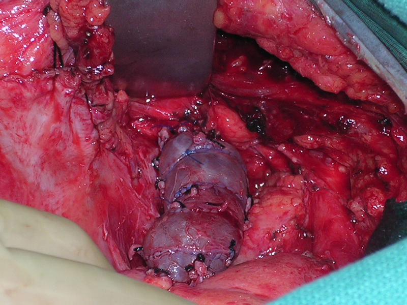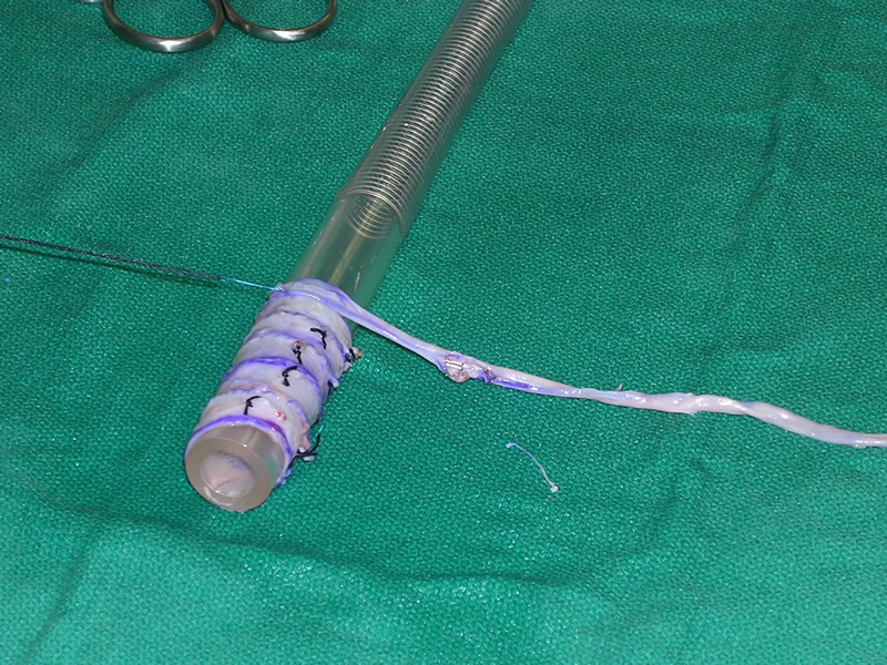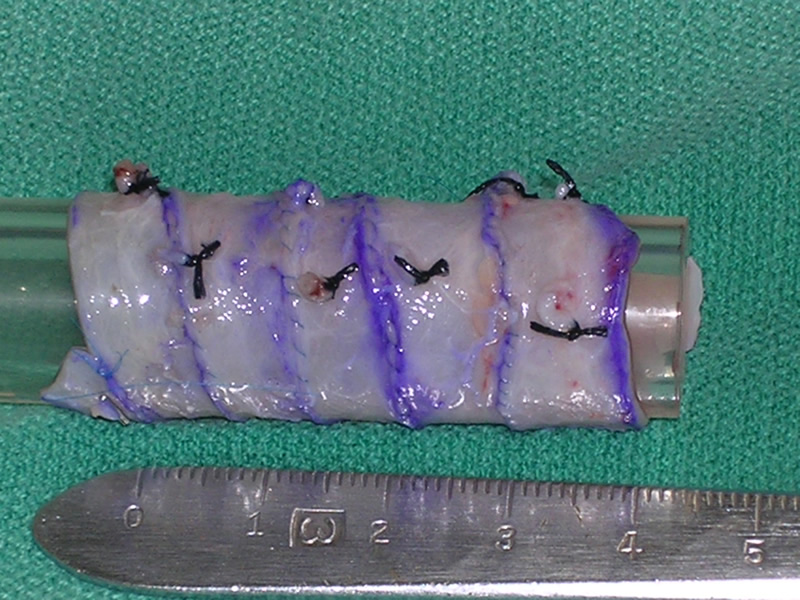 Although malignancy is a frequent cause of SVC obstruction, benign etiologies are increasing in frequency. Iatrogenic SVC obstruction contributes to a significant proportion as evidenced by the increasing number of patients exposed to transvenous pacemaker electrodes and central venous catheters. Troubled by the lack of suitable conduit for SVC reconstruction the Canadian surgeon Ray Chiu developed and perfected the technique of spiral vein grafting in 1973 [1]. Apparently he was inspired by the common ace bandage as he thought of its “ease and adaptability in matching size when wrapping an extremity.” Chiu and colleagues ingeniously devised the new method by harvesting autologous saphenous vein, opening the vessel longitudinally, wrapping it in spiral fashion around a temporary tubular stent such as a chest tube, and then running a monofilament suture to construct the tube graft. The technique is widely versatile and has been used to replace a number of venous passages of varying sizes including the internal jugular vein, portal vein, renal vein, and common femoral vein [2]. Doty, et al, have reported on their experience of SVC bypass using the spiral vein graft and demonstrated excellent long-term patency rates (87.5% patency at a mean of 10.9 years) [3]. The use of spiral vein grafting in benign SVC obstruction is superior to either PTFE grafting or nonsurgical interventions such as PTCA or stenting [4,5]. In summary, spiral vein grafting for benign SVC obstruction demonstrates excellent long-term results with nearly 90% of patients experiencing total resolution of symptoms relating to the SVC syndrome. In addition to benign disease, spiral vein grafting may well be useful for malignant causes of SVC obstruction and in other situations where there is the need for a large caliber vein graft.