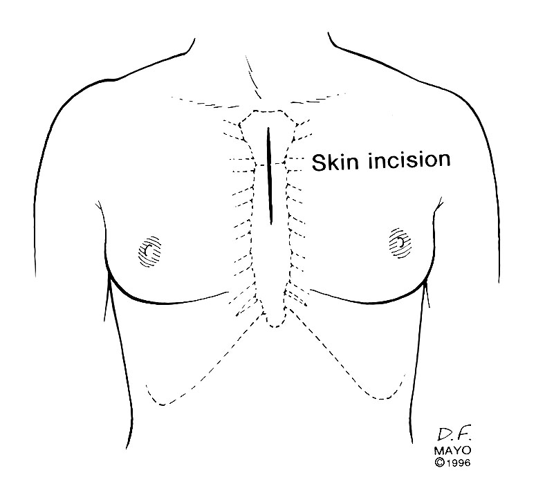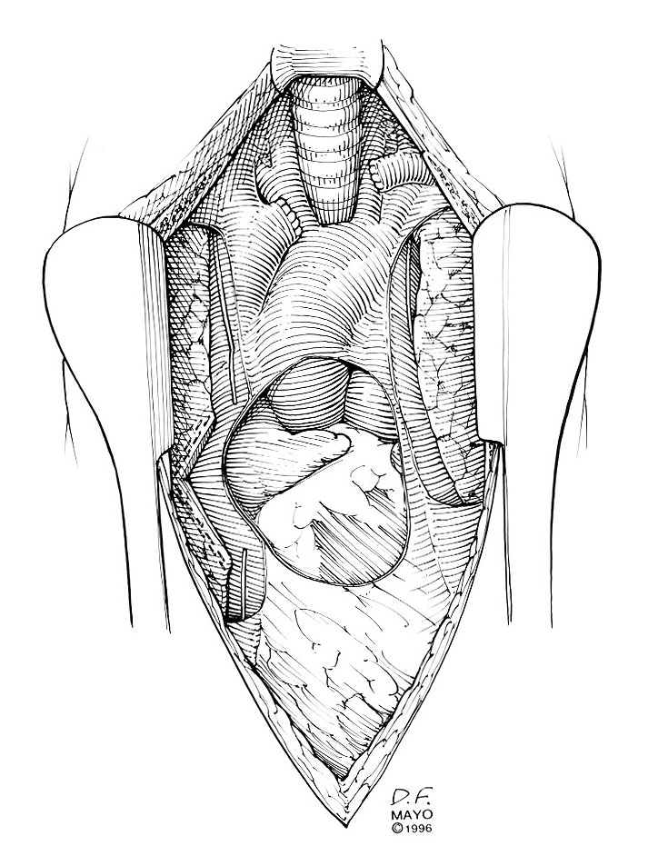 Postoperatively, the patient is extubated in the recovery room, and is closely followed by the surgery and neurology teams. The chest tube is removed when the drainage is low. Patients may or may not be restarted on their medications depending on their clinical condition. If the patient has a thymoma found during preoperative evaluation or at surgery a full sternotomy or a "clamshell" incision is performed (Figure 8). If no invasion of surrounding structures is present a total thymectomy is performed as previously described. If the thymoma invades into the mediastinum an en bloc resection is recommended (Figure 9 left and Figure 9 right). If it is not possible to totally remove the tumor, a debulking procedure is performed and patient is considered for postoperative adjuvant therapy.