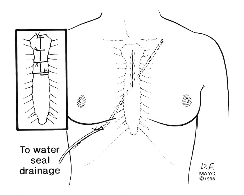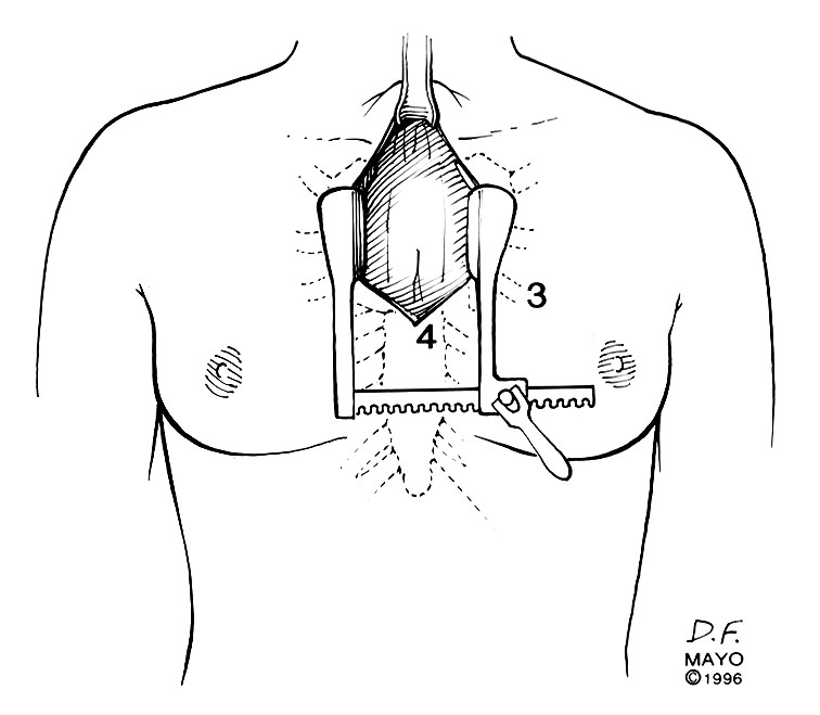 Following the resection of the gland, meticulous hemostasis is performed. It is our experience that patients who underwent plasmapheresis prior to surgery tend to have more postoperative blood loss. A chest tube placed from right anterior chest wall and extending to the contralateral apex via the mediastinum is adequate for postoperative drainage purposes (Figure 7). The sternum is then approximated with interrupted wires and the soft tissue and skin are closed with absorbable stitches, resulting in a relatively comfortable, cosmetically acceptable incision.