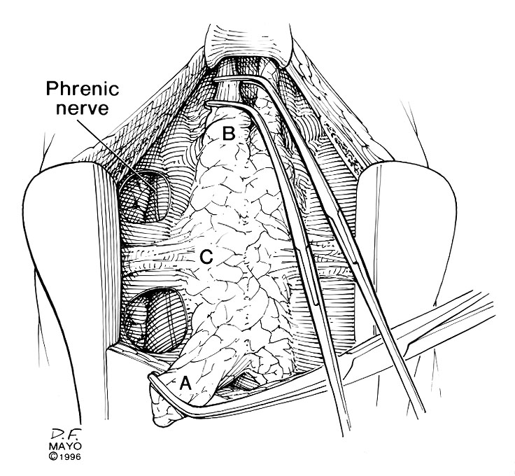 In thymic surgery for myasthenia gravis, the presence or absence of a thymoma dictates the extent of the surgical procedure required. While total thymectomy for myasthenia without thymoma can be performed through a partial sternotomy, the presence of thymoma requires a full sternotomy. During any kind of thymic procedure, the most important step is understanding the anatomy of the phrenic nerves and their close relationship to the thymus5,6 (Figure 1).
