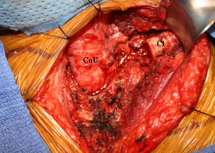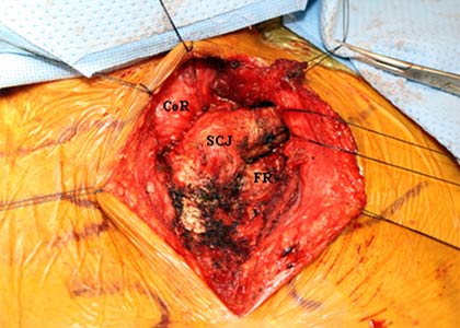 In this report, we describe the unusual case of a patient who had transhiatal resection of her esophageal cancer with a gastric conduit positioned in the anterior mediastinum by a sub-sternal approach, complicated by eventual extrinsic obstruction of the gastric conduit by the left SCJ. While the sub-sternal route for re-establishing enteric continuity can be valuable when the posterior mediastinum is unavailable, use of the sub-sternal route requires widening of the thoracic inlet. This is accomplished by prophylactic resection of the left sternoclavicular joint, including the left half of the manubrium and clavicular head, in order to enlarge the superior thoracic aperture into the superior mediastinum and prevent proximal graft compression (3-6). Sub-sternal placement of any esophageal replacement also creates anterior angulation at the pericardium which makes subsequent dilations and endoscopies of any conduit more difficult (4).