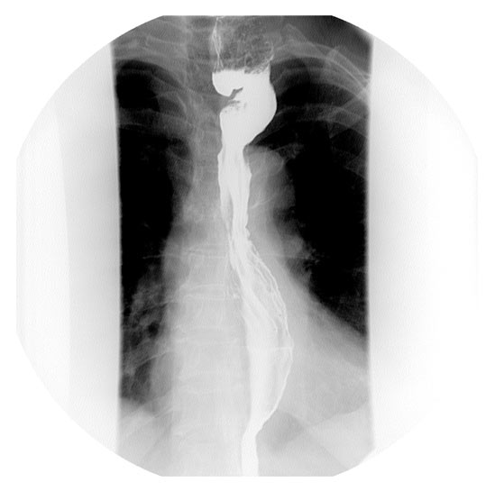 | Figure 4. One year postoperative esophagram showing residual proximal dilatation, but improved transit of contrast through the cervical esophagogastric anastomosis. |