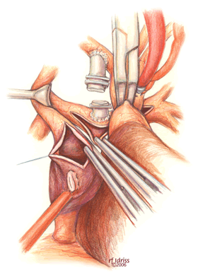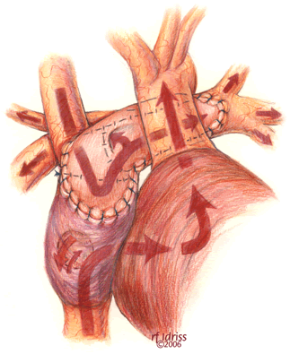 After the heart is deaired, the cross clamp is removed, and the patient is rewarmed to a nasopharyngeal temperature of 35-36oC. Continuous ultrafiltration is used to hemoconcentrate the perfusate, and modified ultrafiltration is used selectively. Low-dose inotropic support may facilitate separation from circulatory support. Fine-caliber lines for pressure monitoring and delivering infusions are placed into the atrium via the cannulation site and secured with a purse string. We do not routinely monitor the cavopulmonary pressure beyond the operative period. A single mediastinal chest tube is often adequate for drainage.